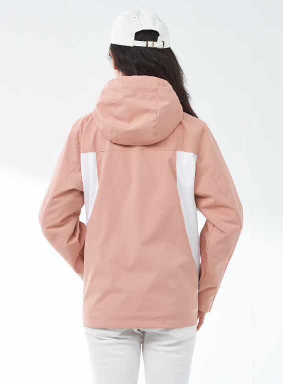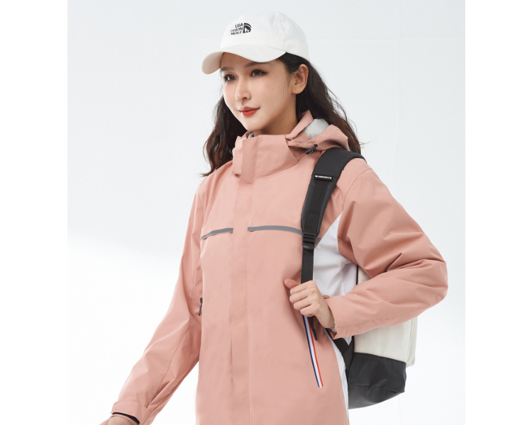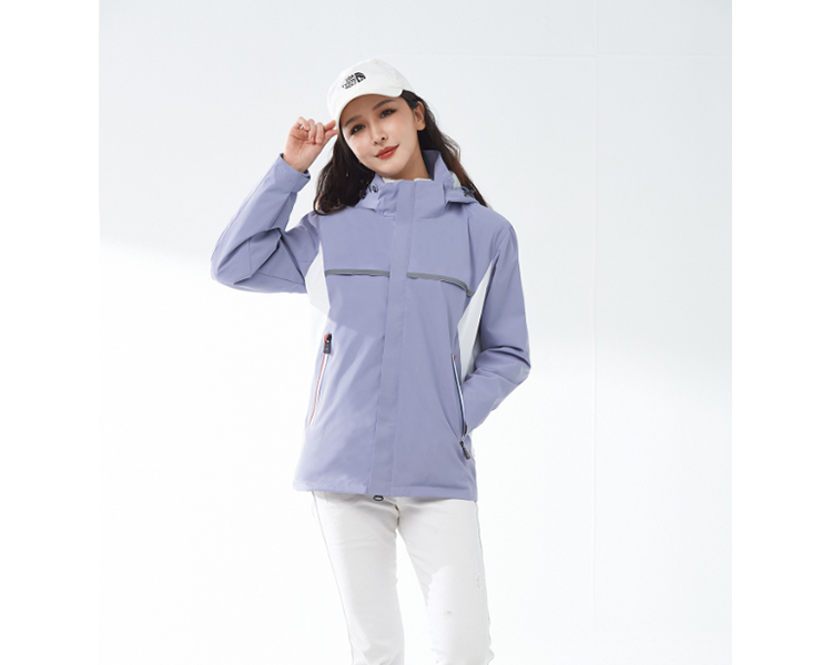 2023新款女士冲锋衣,防风,防水,保暖,公司所做冲锋衣采用特殊的防水面料, 这些面料具有高度透气性和防水性能。它们能够在水分子与纺织品纤维接触时形成一个薄膜,使水分子无法穿透到内部,从而达到防水的目的。