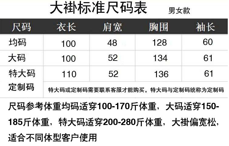 尺码:S、M、L、XL、XXL 。 颜色:可定制,现有白色、灰色、藏蓝色等。